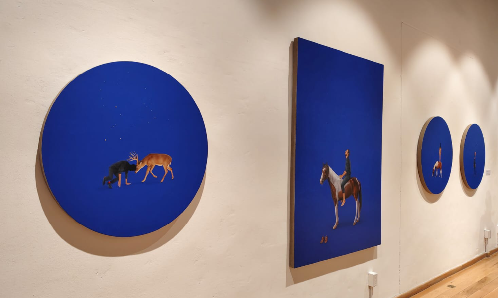 En el plano formal, la muestra también destaca por tratamientos en la composición, la disposición de planos, la escala y la aplicación de color local, rasgos que, lejos de responder a una lógica realista, apuntan a una abstracción del tiempo y del espacio. Varias de las piezas, además, rompen con el formato cuadrangular tradicional de la pintura, reforzando la apuesta del artista por ampliar los límites del soporte.